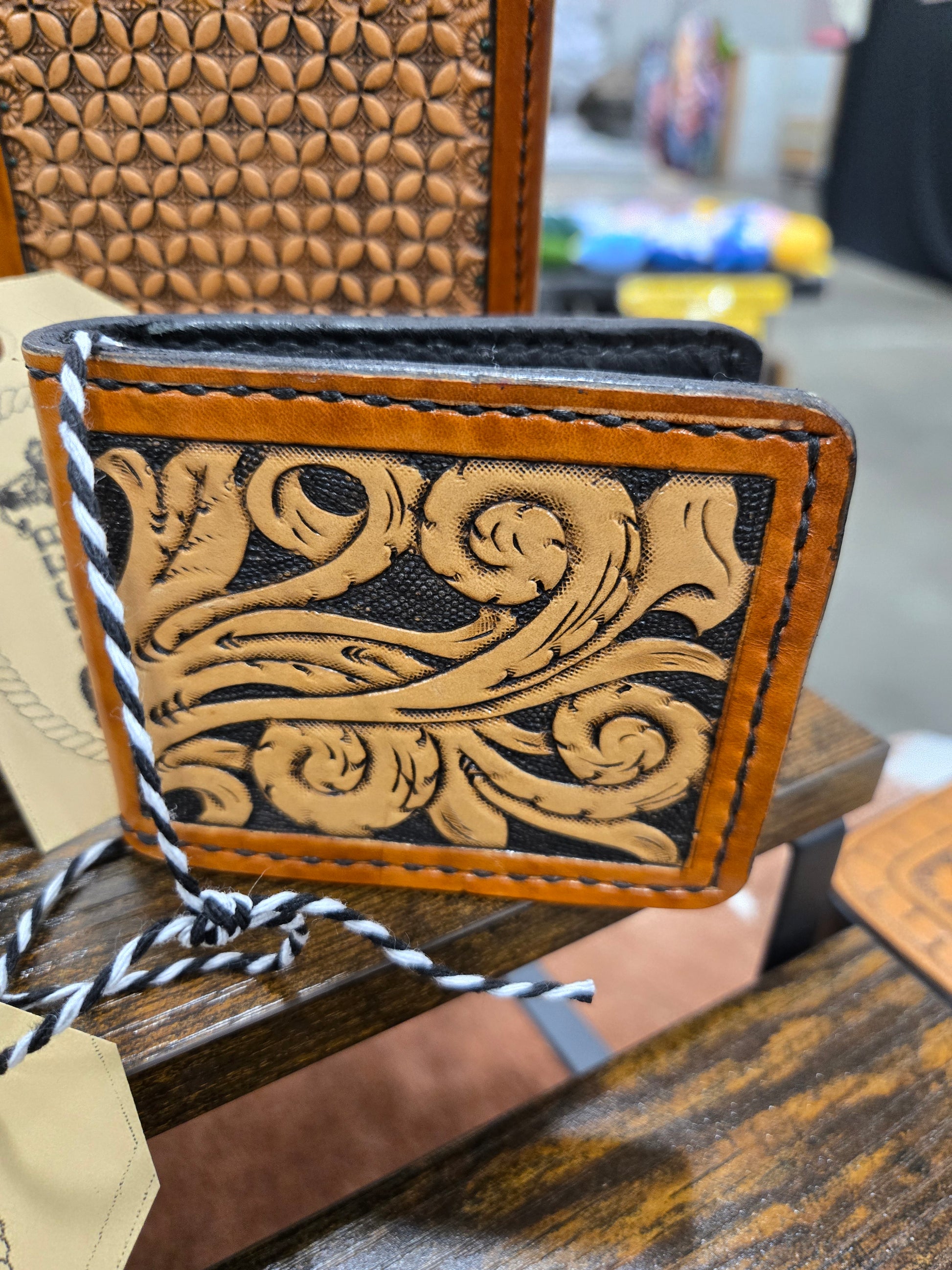 Designed for the minimalist, it features a spring action clip for secure cash holding and two interior card pockets. The exterior boasts a hand-stamped pattern.